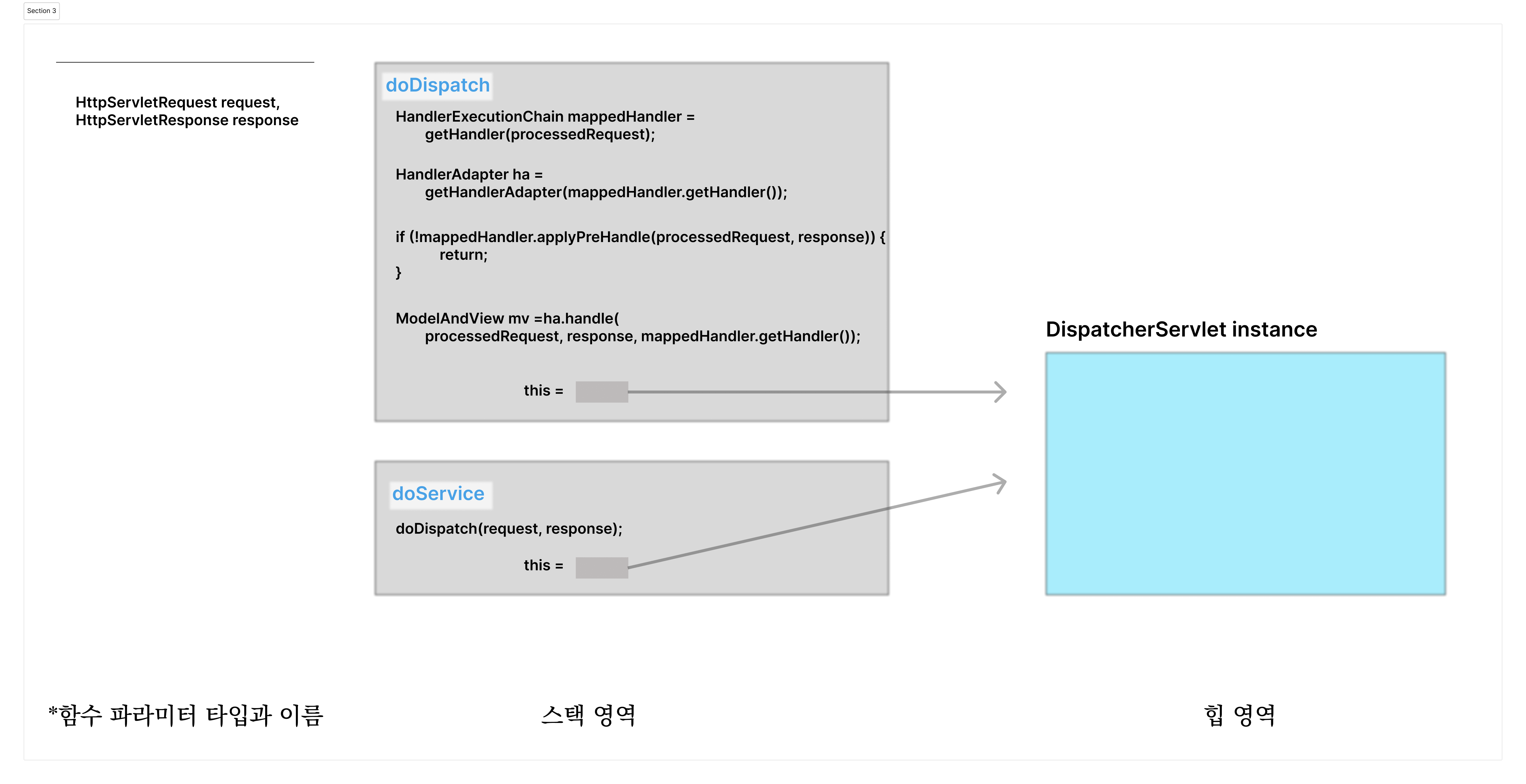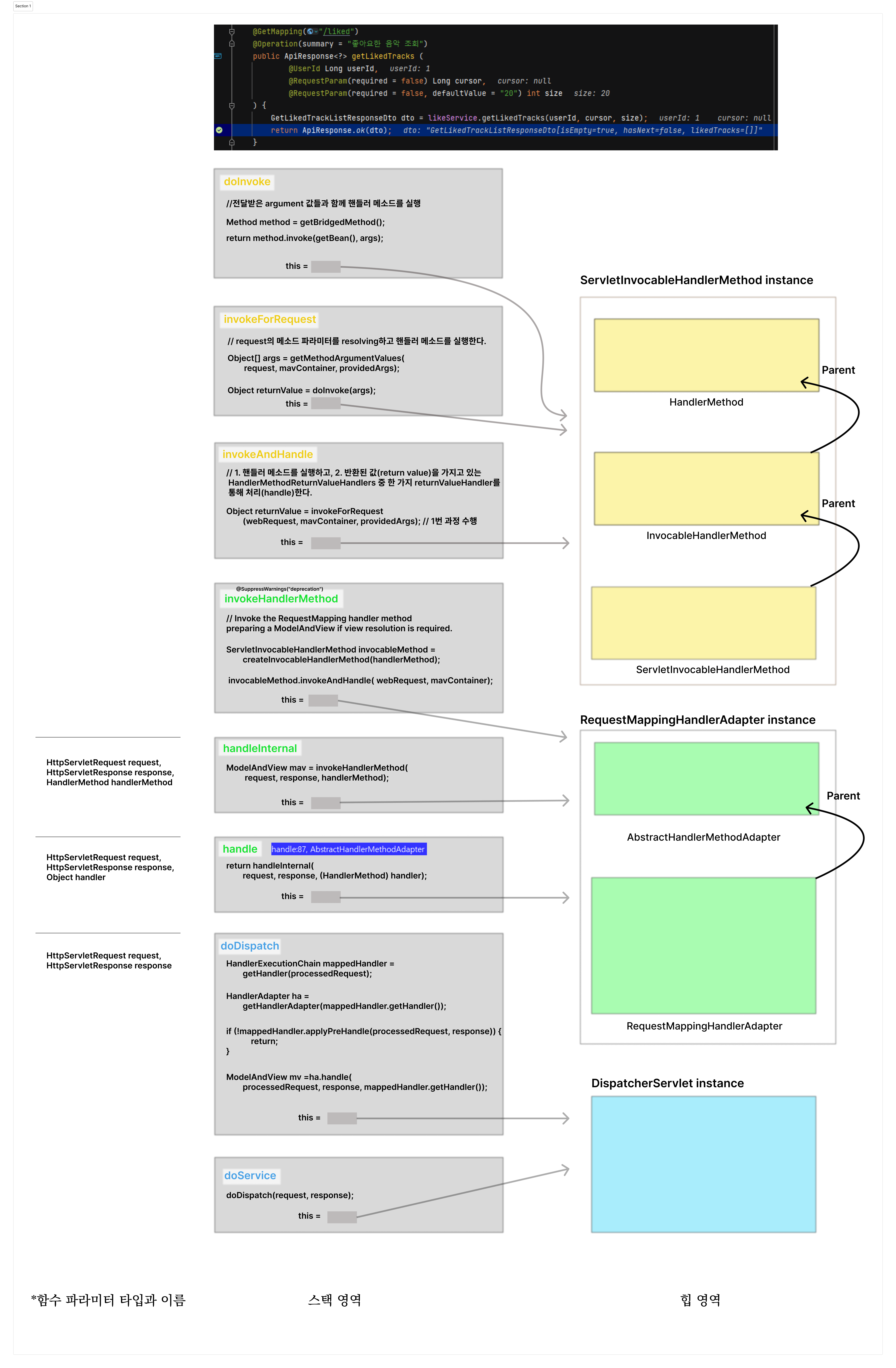 HTTP 요청이 서버로 들어온 뒤 컨트롤러 메서드가 실행되기까지의 흐름을 Dispatcher servlet 단계에서부터 스택 프레임형식으로 표현하였다.